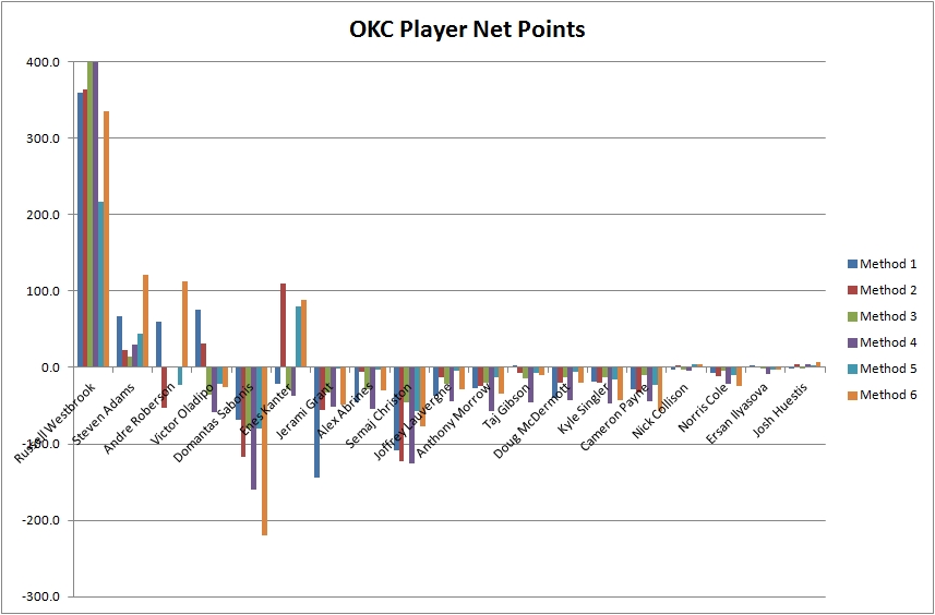 I am surprised at how many methods think that Kanter is a bad player. Not that he's great, especially defensively, but he contributes offensively very well around the rim, whether in the half court or in transition. He is one of the more uncertain players based on the variation in metrics' opinions of him. (The most uncertain is Westbrook because of Method 4 ranking him so far off the charts.)