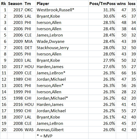 That list is below and you can see that Westbrook and Kobe Bryant's 2006 season are pretty far ahead of any other players in history. The top 20 here consists of guys you know with one name: Lebron, Iverson, Jordan, Kobe, Wade, Harden, Stackhouse, and Arenas.
