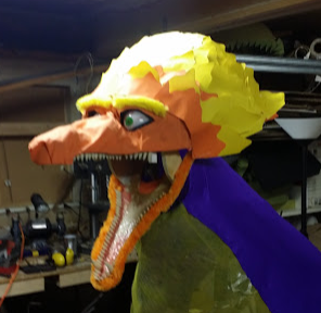 I had 2 goals for this costume. Firstly I wanted it to breath fire. Secondly I wanted it to be tight-fitting around my face so that it would be easy and light to wear. The first goal did not happen, and I did not have fire breath this year (see 1992, 1994, 1996). I did manage to do fairly well with goal number 2. This costume, made of wood, paper mache, and latex rubber coated cloth, attatched snugly around my head with velcro along the green dorsal fin. The teeth and gums were designed so that the teeth are hidden whan the mouth is completely closed, but are quite visible (in a natural way) when the mouth opens. The mechanism involves hinges, springs, wire, and elastic. The mouth opens and closes when I open and close my mouth.