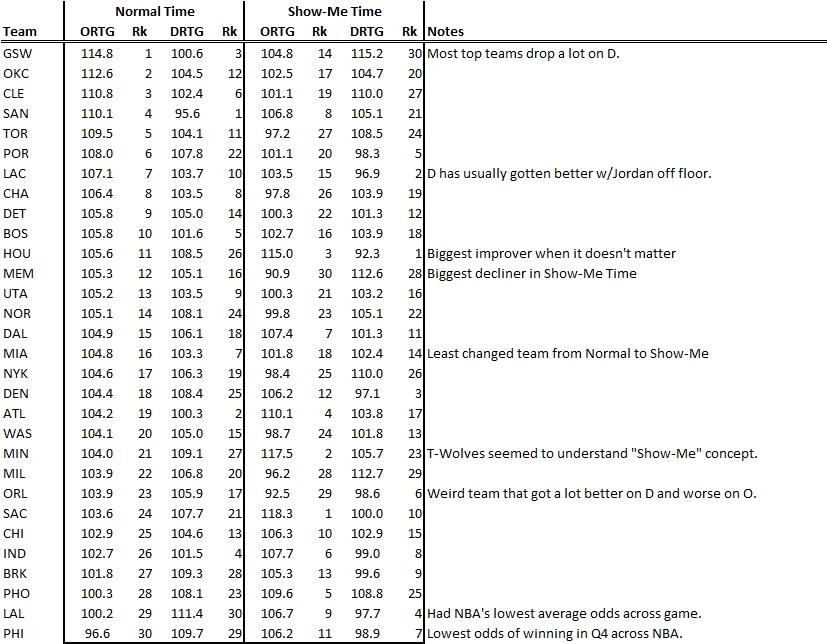 Show-Me Time is what makes it look like teams play up or down to their opponents. These aren't points that lead to wins, they're empty points gained or lost when the chance of winning doesn't change. The best team this year during this period was Houston - the 8th seed in the West after a very disappointing year. The worst team was Memphis, who finished one game ahead of Houston. "Show-Me Time" may matter for the Ryan Bowen's of the league, but it doesn't reflect winning and losing.