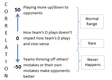 This results from teams' natural variability in performing, both on the offensive side and on the defensive side. Teams aren't fully consistent - they're erratic, playing well sometimes and playing poor other times. What this method also sees, though, is that almost all teams tend to play to the level of their opponents - not all the way, but to some degree. In the underlying method, there is a mathematical term called a correlation that was positive, indicating this correlation. The more positive this number, the more teams played up or down, in general, to their opponents. The closer it gets to zero, the less a team does this. If the number goes negative, then teams actually use their opponents mistakes on defense to make their offense better. Or their own mistakes on one end hurt them on the other end.