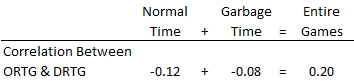 The last thing about this that was interesting was that the correlation between offense and defense in both Normal Time and Show-Me Time was negative. The correlation in Normal Time was about -0.12 and in Show-Me Time about -0.08. Two negative correlations, yet the correlation across entire games was positive at +0.20. Two negatives add up to a positive in a seeming contradiction that only reflects how much the game changes between Normal Time and when Ryan Bowen is trying to show you he can play.