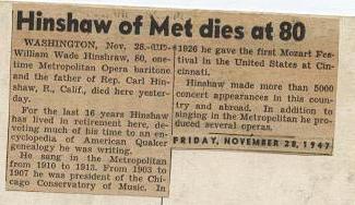 Hinshaw made more than 5000 concert appearances in this country and abroad. In addition to singing in the Metropolitan he produced several operas.