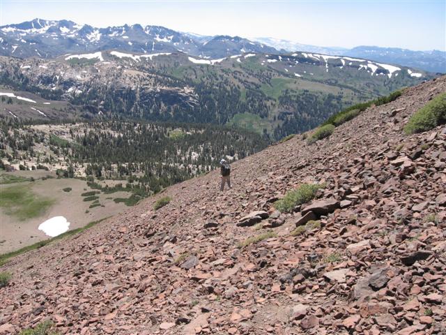 A steep trail lead up to St. Marys Pass, at which point we could see an ominous Stanislaus Peak in the distance. We took a right up a short rise and across a plain to reach the base of Sonora Peak. The trail disappeared a bit after the pass, but a use trail was visible on the side of the mountain, so we headed cross country in the general direction. From there, it was a short, steep hike to a false summit and then to the peak.