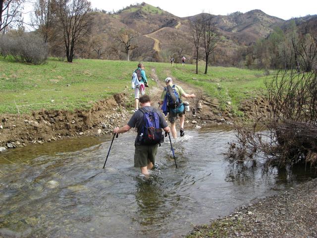 The climb to Jackass Pass warmed us up and it was looking to be a beautiful day. On the downhill section of Blue Ridge Rd there were thousands of Shooting Stars, and every time we said it Peter looked up into the sky. At the bottom of Blue Ridge Rd we started on a new trail for INCH – Bear Mtn Rd. It paralleled the East Fork of Coyote Creek for about a mile, then we had our next creek crossing, and this is where the real fun began.